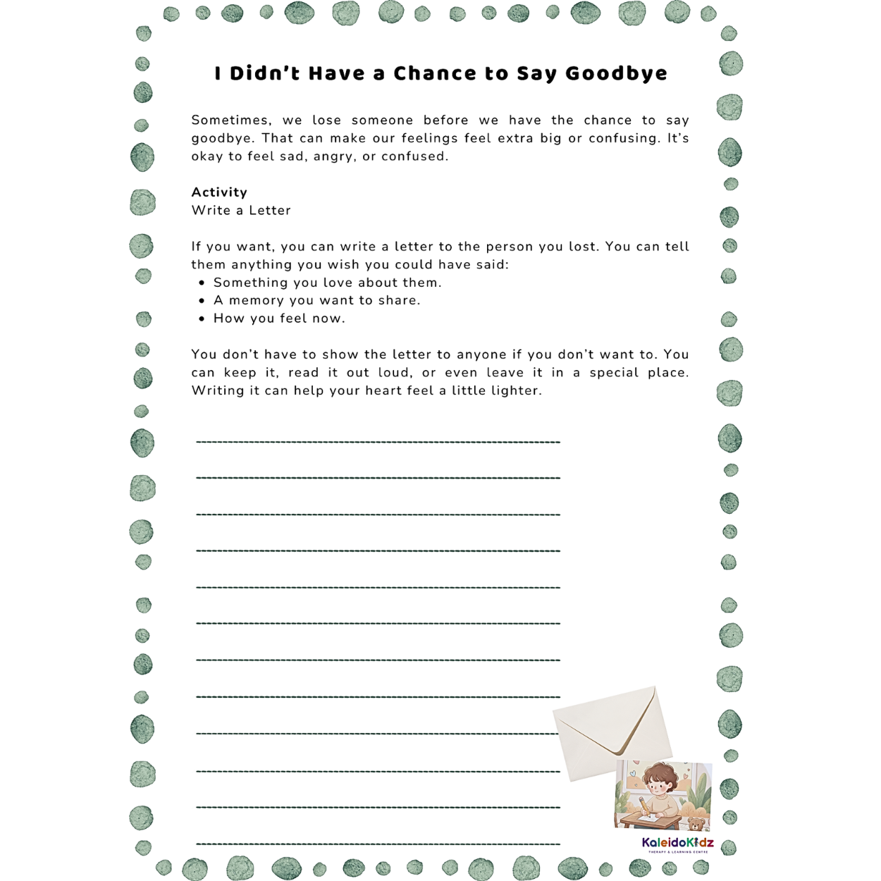 This is a gentle, child-friendly workbook that helps children understand and express their feelings after loss. Through guided exercises and reflective prompts, like writing letters to loved ones they didn’t get to say goodbye to, children can explore their emotions in a safe and supportive way.